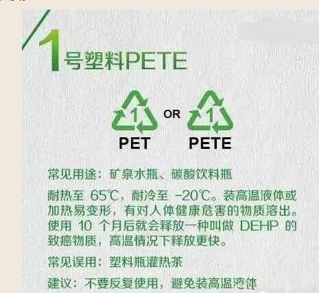 常見礦泉水瓶、碳酸飲料瓶等 。耐熱至70℃易變形, 有對人體有害的物質融出。1號塑料品用了10個月后,可能釋放出致癌物DEHP。不能放在汽車內曬太陽;不要裝酒、油等物質。